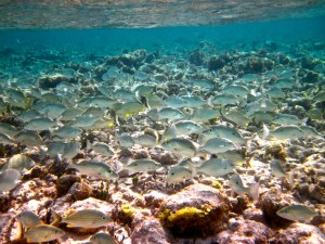 After lunch we head out to the rocky rubble and sea grass habitats in the lagoon to look for the YOY Nassaus. Each of the snorkelers looks for a YOY, when we find one we notify Bradley, a Caymanian who works for the Cayman Island Department of the Environment. He drives the boat over and we try to catch it. The YOYs occupy holes in the rocks where they can wait for prey to come by and retreat into the crevices for protection from predators. They are incredibly good at hiding in their holes and avoiding the nets. When, or rather if, we catch them we measure them, take a small fin clip to do genetic work, tag the fish and let it go back right where we found it. By getting the genetics of the fish we can see if it is an offspring of the Little Cayman adults or if it drifted here from another location. Understanding the connectivity will help us better understand the population dynamics and how the species can be better managed and conserved.