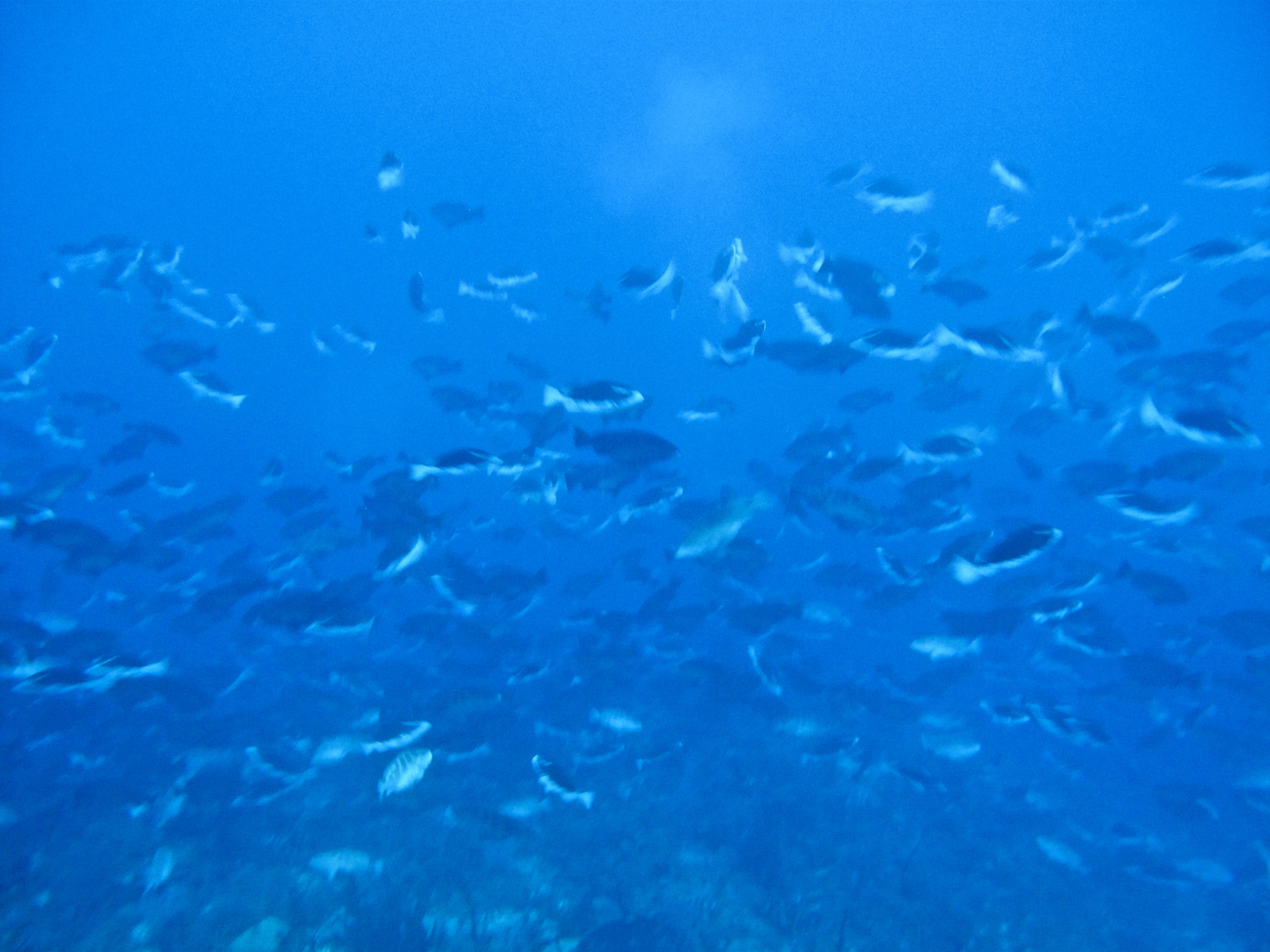 The second day of diving the current finally picks up. Brice and I easily drift down to the edge of the plateau where the wall drops off into the depths. The fish are scattered over the plateau and more concentrated over the wall. The ones over the wall are mostly in the dark color phase while the ones on the reef are mostly barred. I want to stay at look at the fish along the wall but Brice signals that it’s time to start kicking back to the boat. And kick we did. The current provides an uninvited workout.