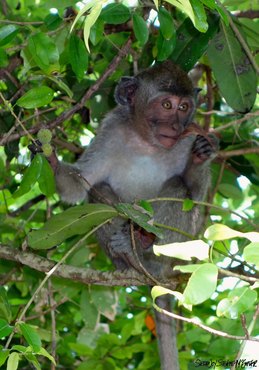 Young monkeys played together, tumbling across the temple floor. Moms and young babies sat on the rooftop. One monkey climbed aboard a white umbrella sticking out of the temple roof, and began bouncing on it. Thrilled, we watched them play and move about. The monkeys began to take interest in us and came closer which at first we were excited by. Then a few moved in quickly. I turned to find a grandpa monkey standing on the tree trunk behind me, it snarled and revealed pointed fangs. As Dave puts it, “We took the clue and exited quickly.”