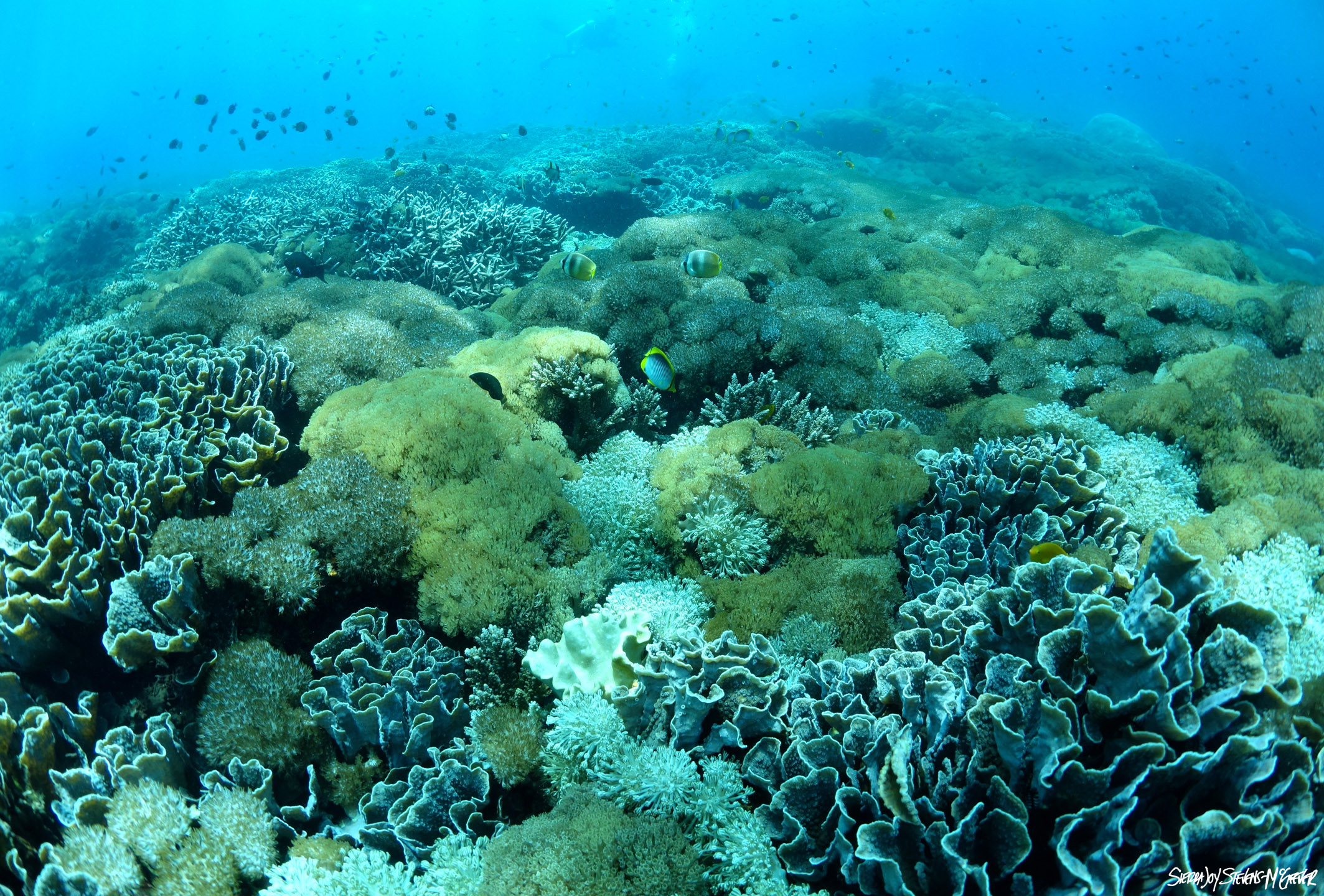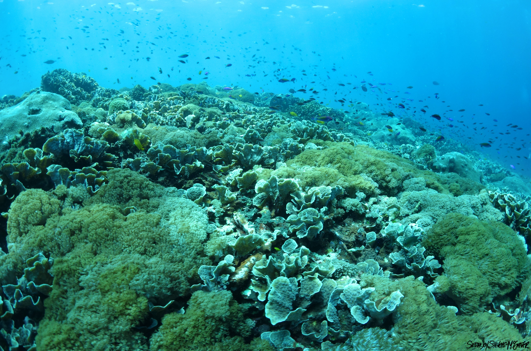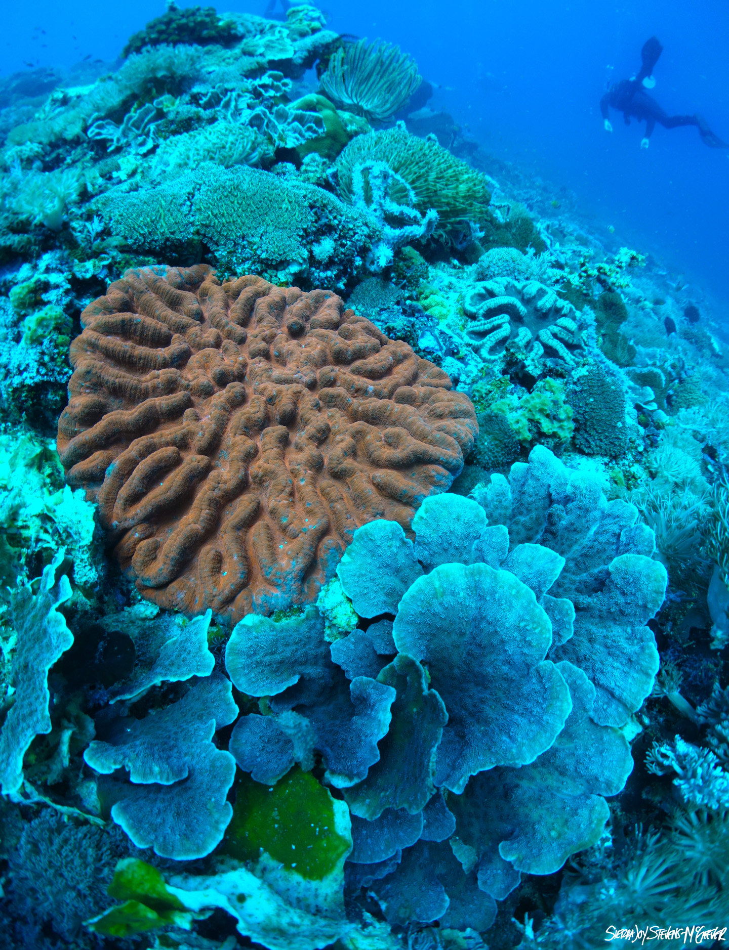 DSC04317 - Version 2 The people at the dive shop told us the diving was better here than in the Gilis and they were right. The reefs here are more alive than I have ever seen before. The bottom is completely covered with an overlapping patchwork of corals, humongous sponges, tunicates and what Dave likes to call psychedelic cauliflower. Fish swarm the reefs.