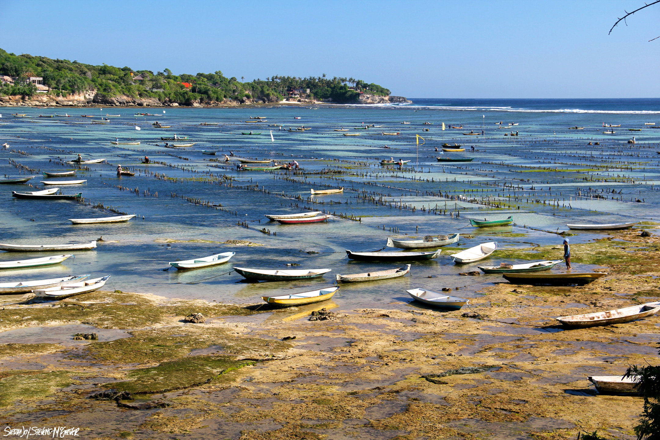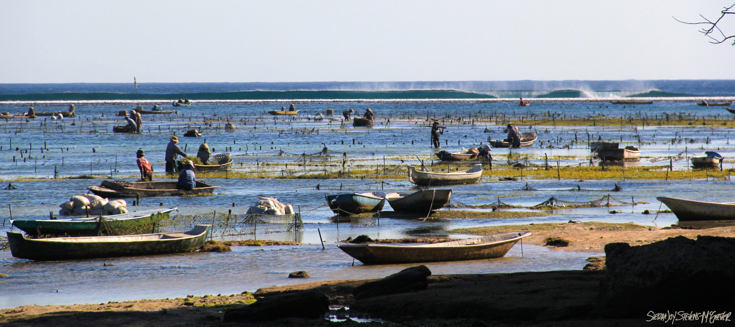 IMG_6850 - Version 2 Most of the local people are sea weed farmers. Roughly three inch thick branches are sharpened on one side by hand and stuck into the sand in the shallows inside the barrier reef. Two parallel lines of these branches are set out with rope hanging in between for the seaweed to grow on. These dark rectangular plots make a patch work in all the inland waters and shallow protected coastal areas. The locals go out at low tide to harvest the sea weed, plant more and maintain the plots. They push motorless boats along with long poles, gather sea weed in vast baskets and in the bottom of their slender boats. When the tide gets exceedingly low the area inside the outer reef looks more like an agricultural field than a beach.