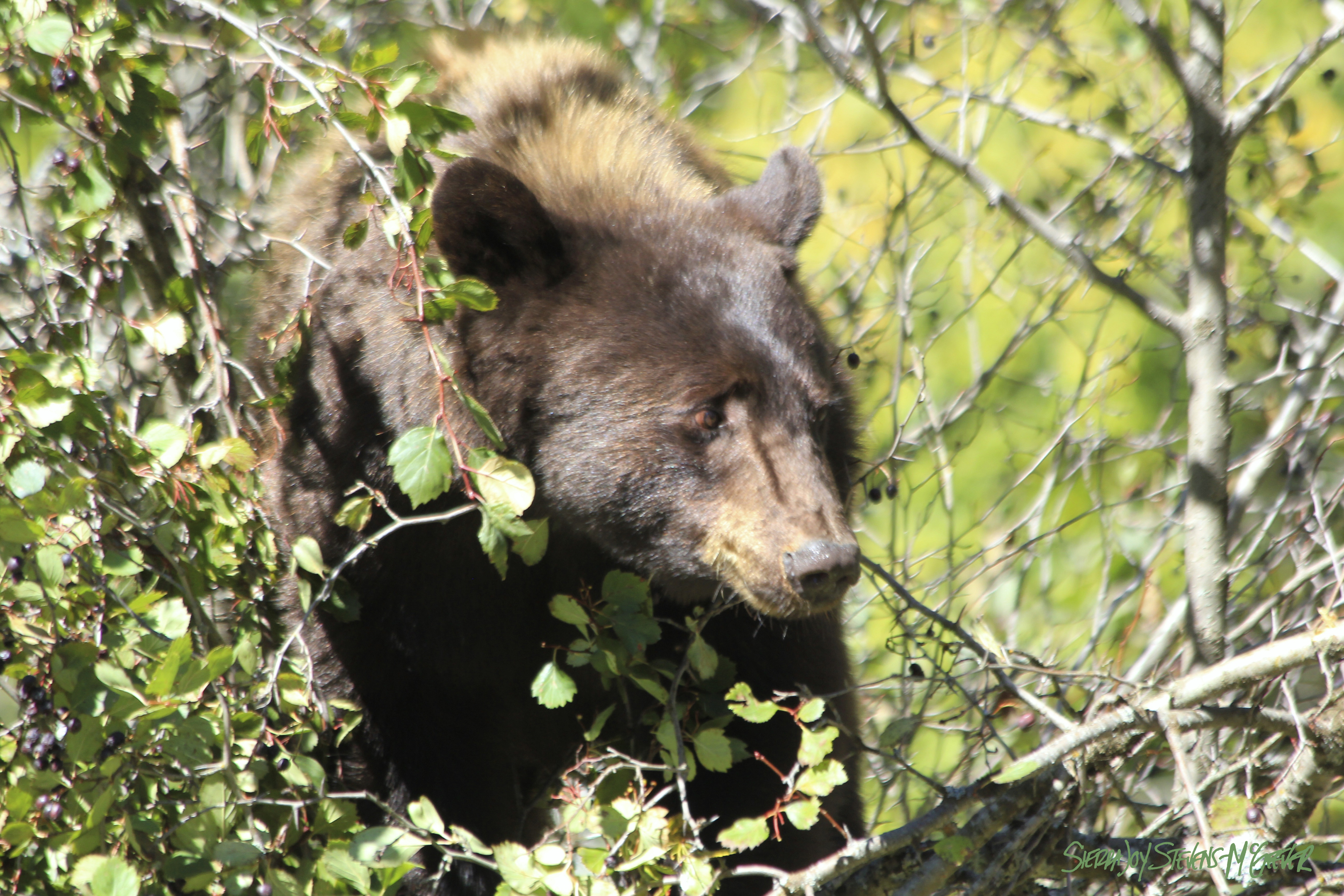 The heat of summer dwindls and days contract their length. Trees draw the chlorophyll from their leaves, storing the precious life-force for warmer times to come. Each leaf transforms from the vibrancy of summer green to golden, orange and red, finally falling to the forest floor in piles of colorful grandeur. As deciduous trees prepare for the winter dormancy, so do the bears. In mid-October, one black bear[2] shook the branches of a huckleberry tree as it climbed higher, picking berries both with short-clawed hands and with a long golden snout. Sunlight danced on its brown forehead, its eyebrows furrowed slightly as it blinked into the sun. Fluidly it reared up to grab the berries overhead, the tree creaked slightly, the sun shown on the bear’s golden back, berries disappeared in rapid succession. Soon the berries would succumb to frost. Soon the bear would turn back to feasting on greens and roots. Soon it would search for nuts and hunt small game and fish, in a stage of hyperphagia, packing on as much fat as it could, before retiring for the winter. But today the sun shared its warmth, today the last huckleberries remained, today I watched the bear in perfect silence.