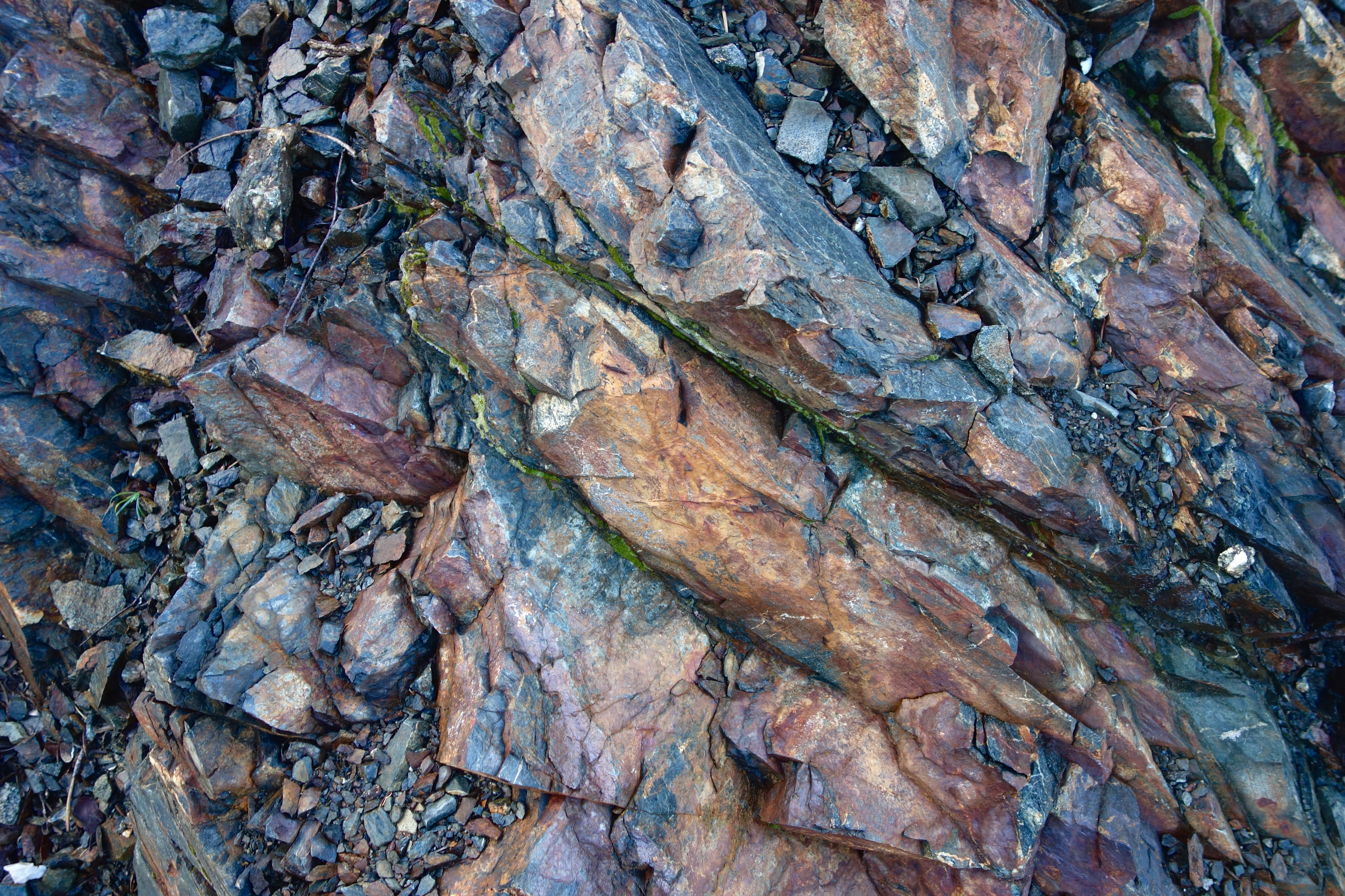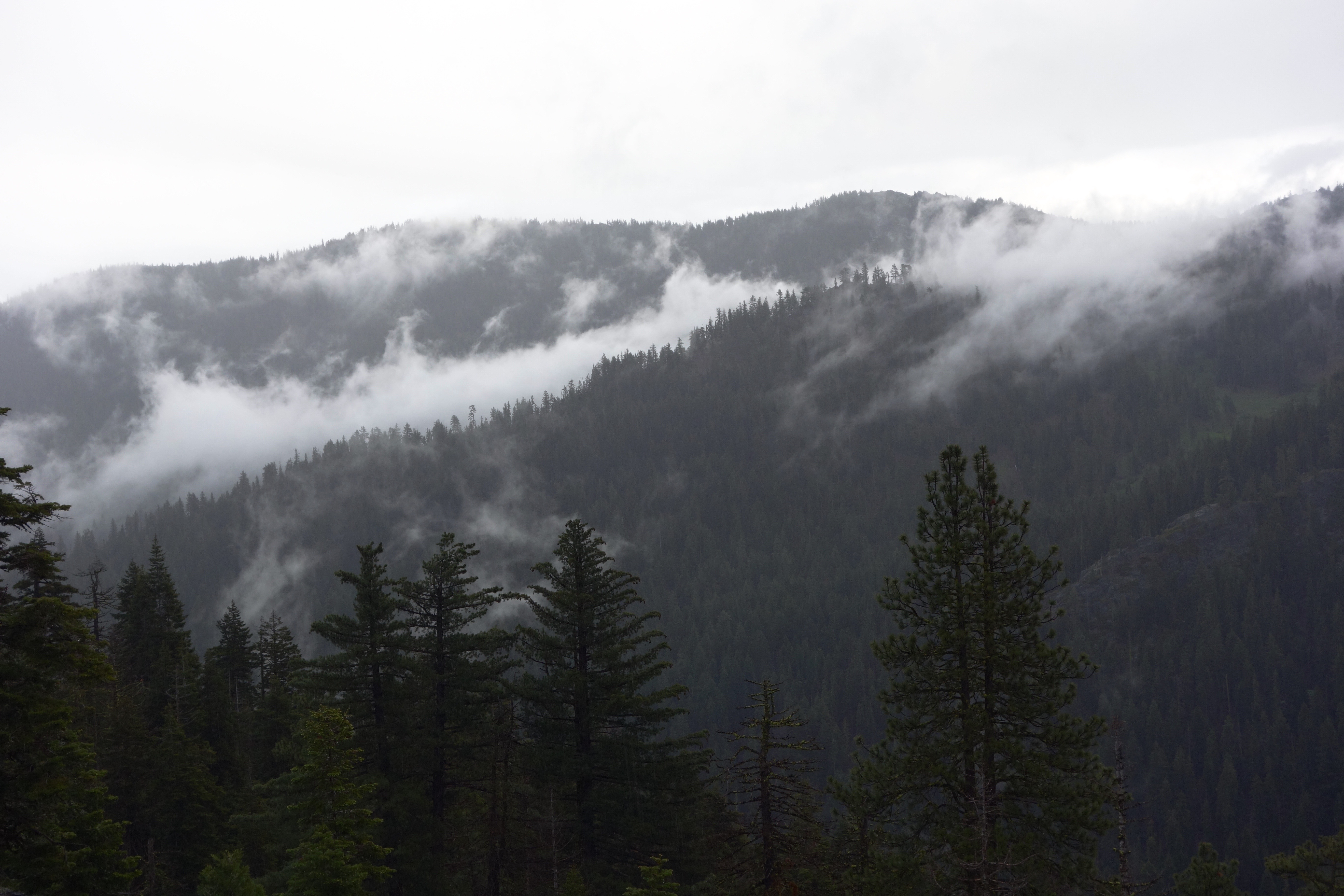 DSC06147The raindrops fell steadily and pattered on our coats and caught in the needles of the trees. As the path rose the cushioned needles gave way to shards of rock, dark slate and a rich red with scattered chunks of white quartz vein, shining slightly and slick with water. We climbed as the trail paralleled the ridge, just below the crest. The forest opened and offered views to Scott valley below, so far down that we could see directly over the triangular tops of the trees at the bottom. Above us cracked peaks rose against a gray skyline. Across the valley, wisping fog flirted with the overlapping ridgeline, its ever changing shape constantly dissipating and reforming along the contours of the land.