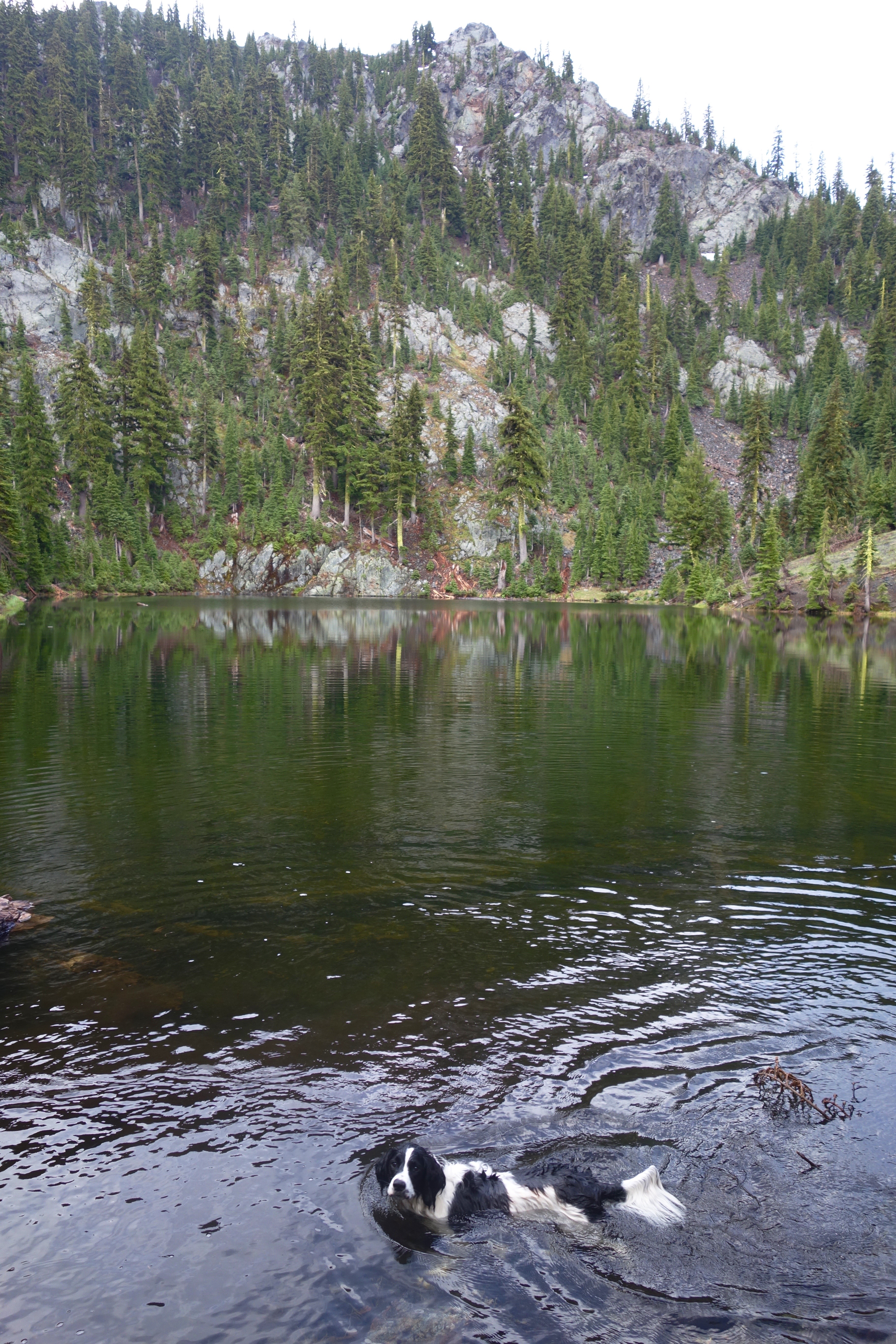 DSC06128We pushed on and entered a forest again, summiting a section of the mountain and then, through the trees I could see water. Jackson ran a head of the waters edge and I had to call him back. He obeyed immediately and looked up at me. In turn, I looked down at him and considered putting his leash back on to keep him away from the lake. Instead I pulled off his raincoat, smiled at him and said softly go play, his release cue. He smiled up at me and ran back to the waters edge and slid in, paddling out into the lake in great circles of glory, happiness shining through his face. We stood on the shore and shook our heads in amusement, the great water dog.