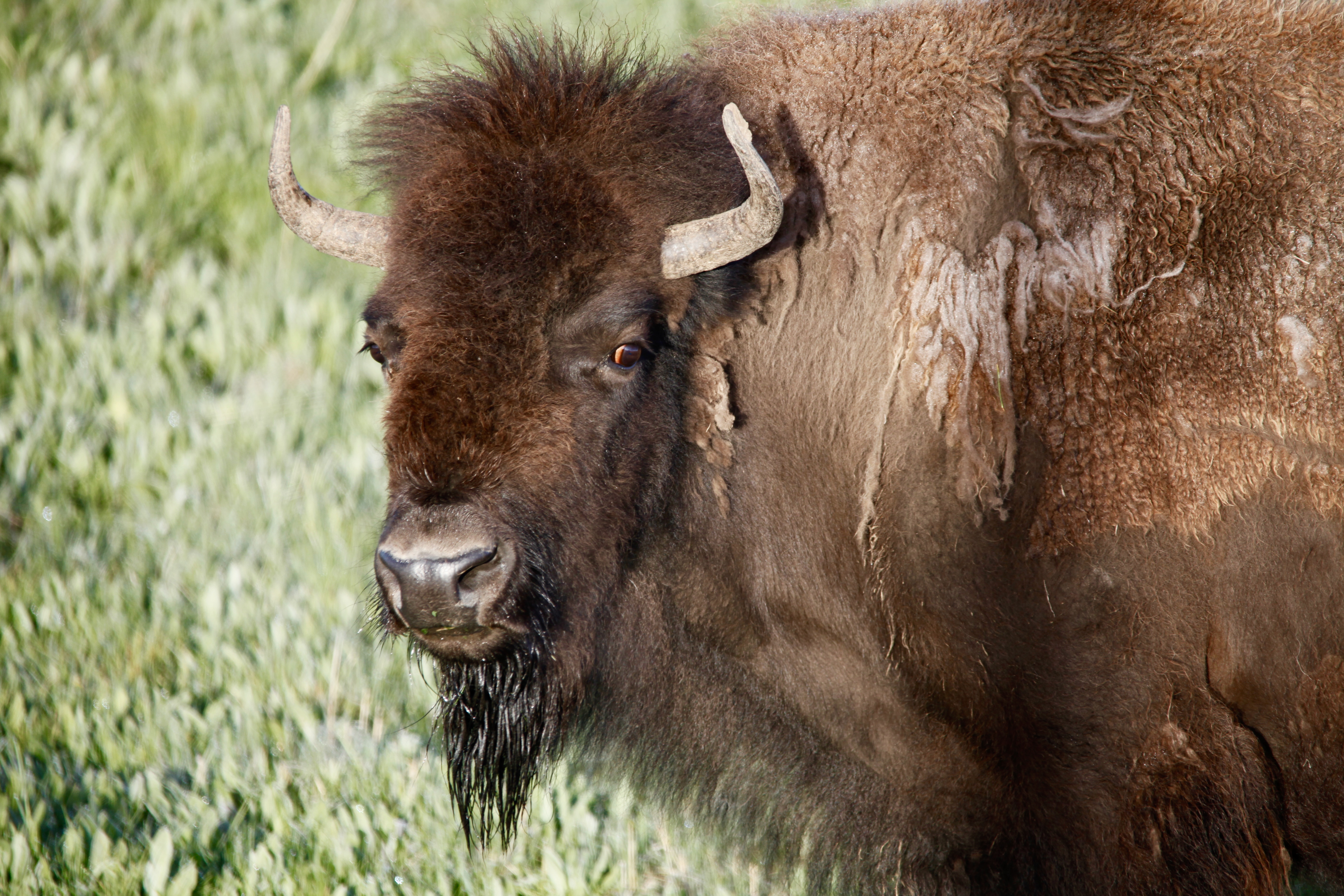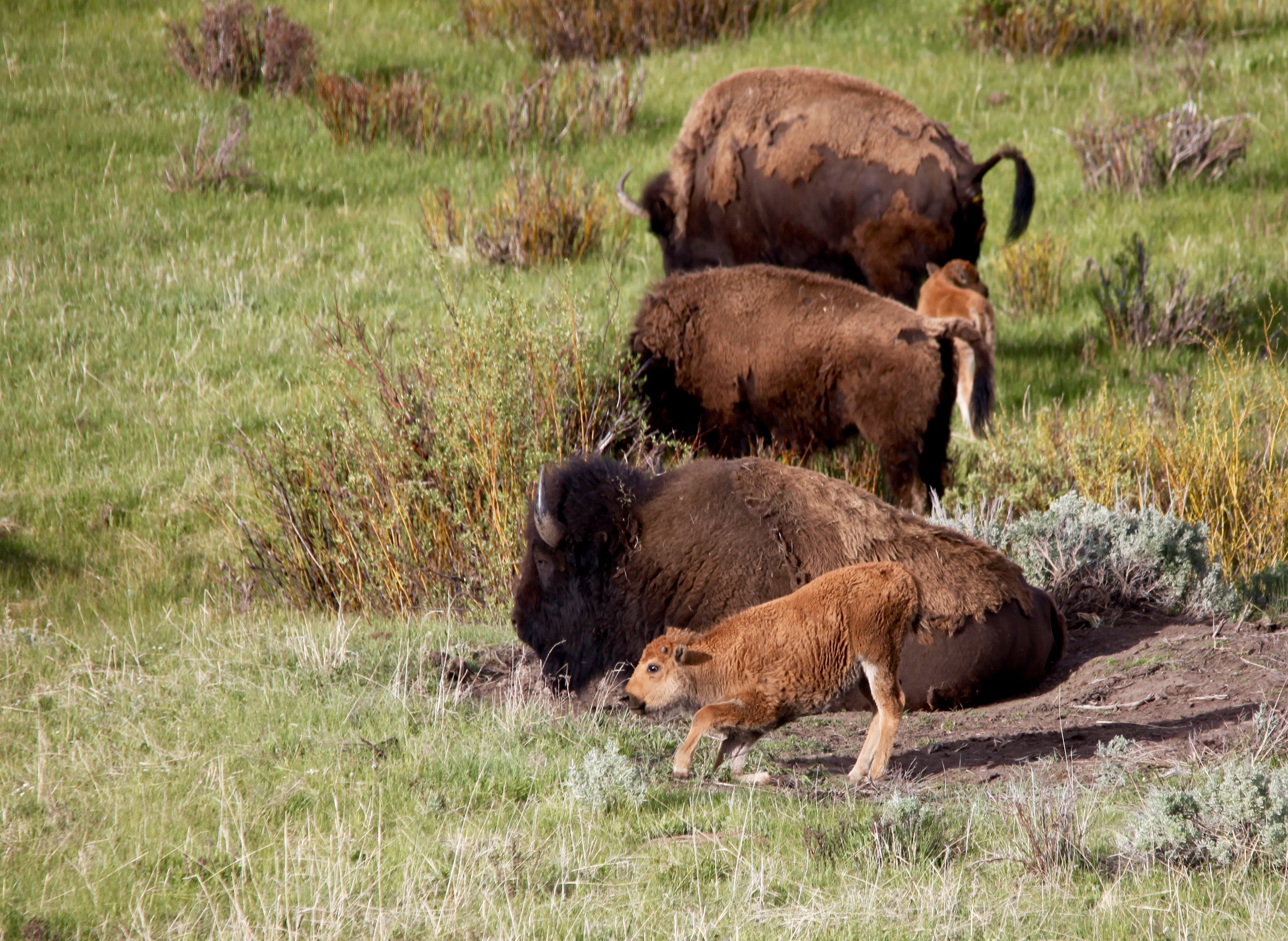 Bison calfIn their first months of life calves, sometimes referred to as ‘red dogs’ for the rusted hue in their natal fur, stick close by their moms in large “cow” herds made up of cows, calves and some immature bulls. Spring calves seem to find their feet with great enjoyment—running in erratic spurts, leaping into the air, snorting. They interact with each other, nuzzle their mothers, nurse, grow, nurse, grow, and begin learning how to forage on grasses, sedges and forbs by watching what the herd is eating. Staying close to mom and the herd is important since emerging hungry grizzlies and other predators are constantly looking for the easiest meal.