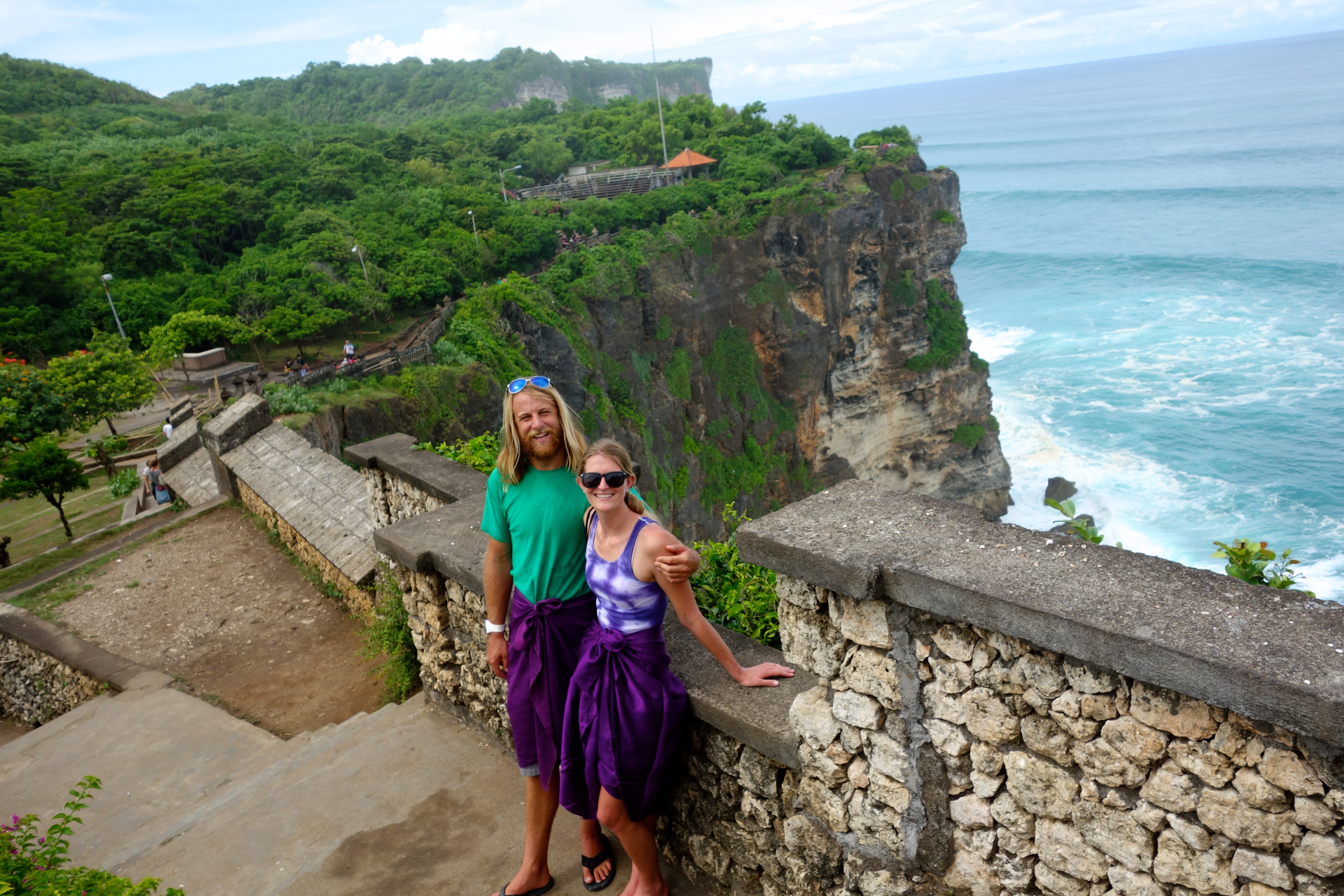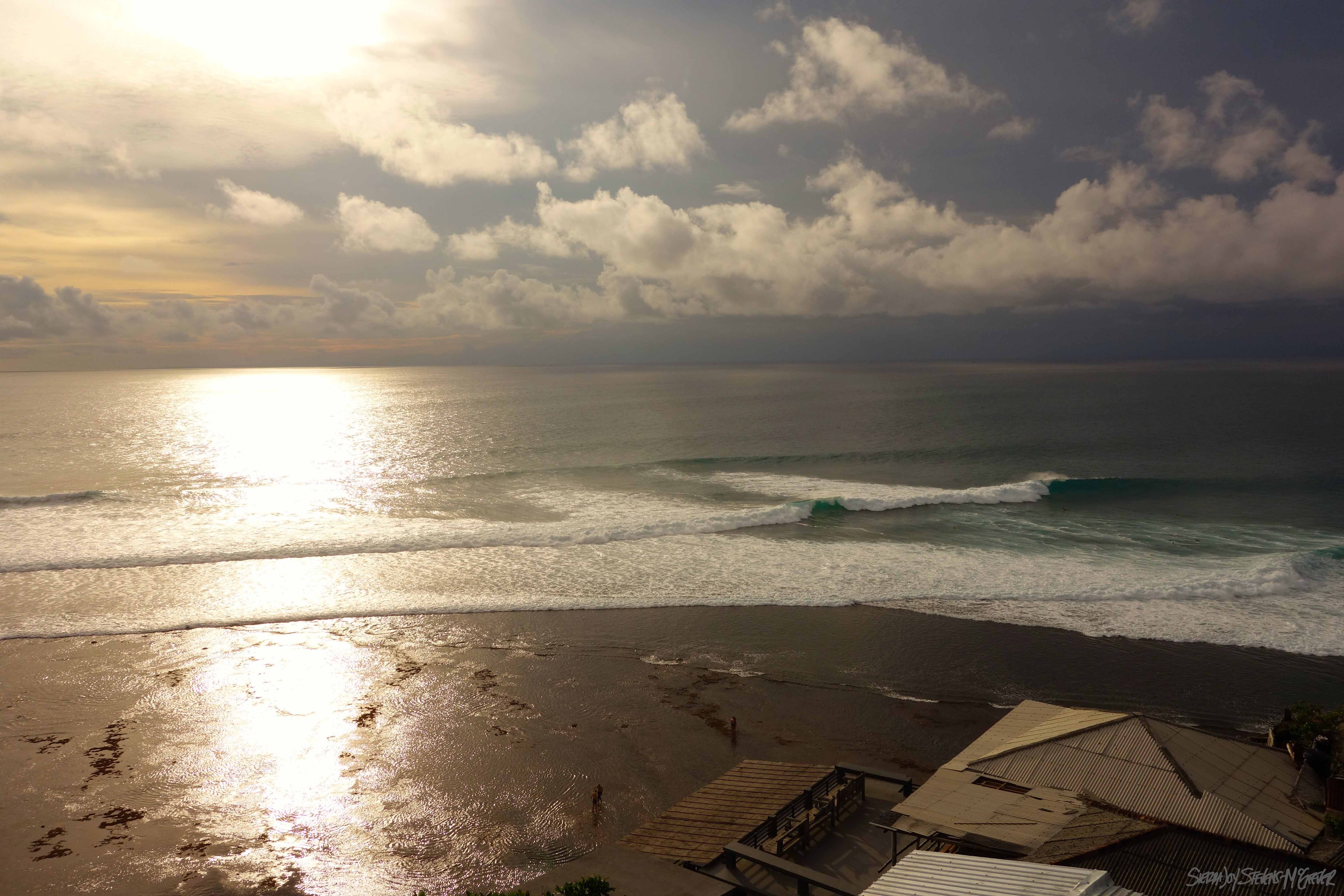 “We were told that most of the waves around, including Uluwatu, worked best on a medium low tide. With this in mind, we checked Ulu’s the first morning of our stay on this remote part of the Bukit peninsula. It was high tide, about 20 people out, and the waves were huge! Watching some of the surfers drop in, it was clear that the waves were at least 20 ft on the sets. Knowing that my board was not big enough, and hearing that high tide was not the best time to surf, Sierra and decided to visit the famous Uluwatu temple and wait for the conditions to shift. After spending a few hours at this beautiful temple, which is perched on a 500ft cliff overlooking the water, we decide to head back home, eat lunch, and then check the surf again.
