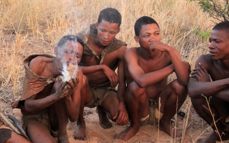 In the heart of the Kalahari Desert live a small, strong people with slanted eyes, wide noses and caramel skin. Their slender bodies are adapted to moving through this arid yellow land. Women gather nuts, fruits and roots, knowing what each plant has to offer: food, medicine, dye, building material. The men hunt, mostly antelope, with poison arrows in multiple day pursuits: stocking the animal until they are close enough to shoot, then running after it as it flees, arrow lodged in its body, for days until finally the poison sets in, slows the animal and it can be sacrificed.
